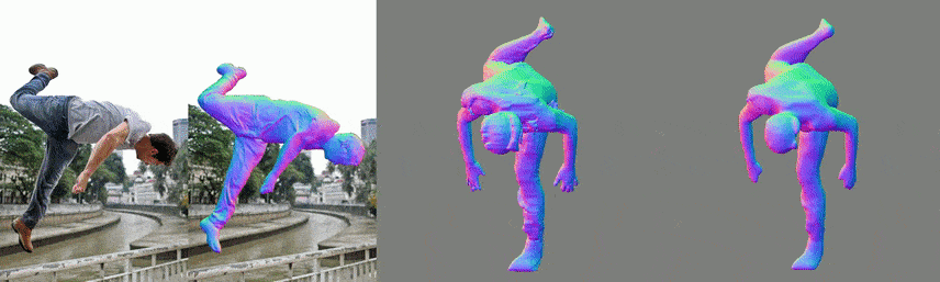 ICON 在思路上借鉴了很多相关工作,比如 PIFuHD 里面的法向图(Normal Image),并和 PaMIR 一样都用了 SMPL body 做几何空间约束。这两个信息都是不可或缺的:SMPL body 提供了一个粗糙的人体几何,而法向图则包含了丰富的衣服褶皱细节,一粗一细,相得益彰。