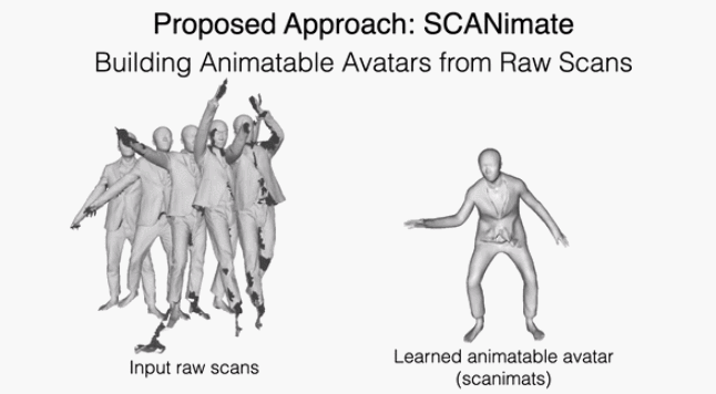 但是,数量足够多且姿势各异的三维人体却是 SCANimate 构建高质量可驱动数字人的必要前提!这个不难理解 —— 要让一个数字人无论怎么动弹,衣服裤子的褶皱都很真实,如果用数据驱动的思路去做,那么网络得先「看过足够多」类似动作下衣服的形变,才能准确摸索出衣服形变与动作姿势之间的关联。
