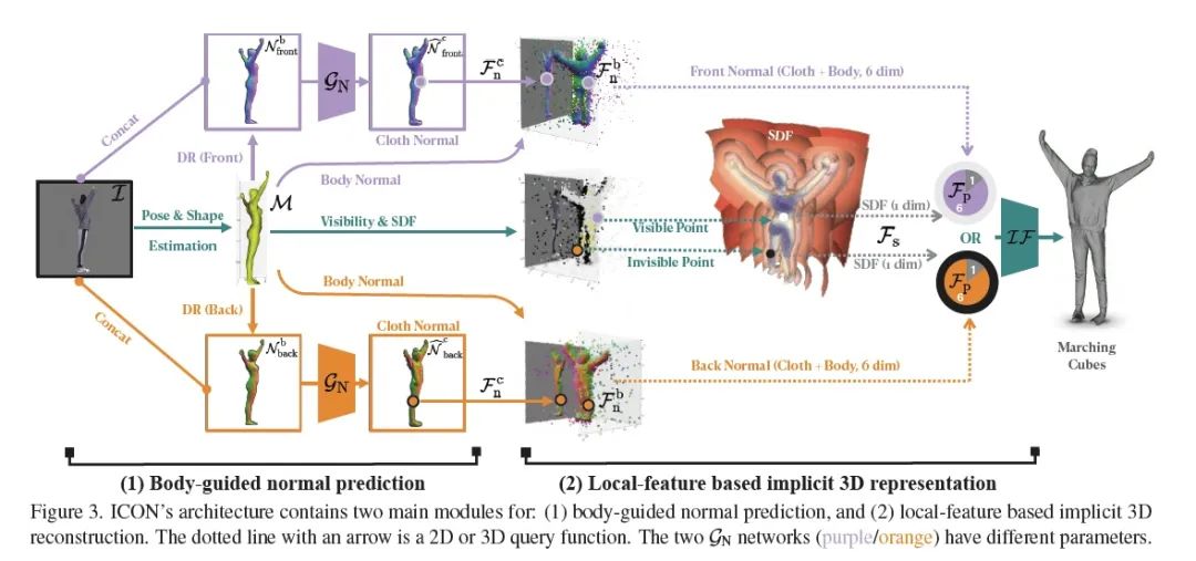 下面这张图展示了 ICON 整体处理 pipeline。先从图像中预测 SMPL body,渲染出正反 body normal,与原始图像合并起来,过一个法向预测网络,出正反 clothed normal。然后对于三维空间中的点,clothed normal 取三维,body normal 上取三维(注意,这里是从 SMPL mesh 上用最近邻取的,而不是从 body normal image 中取的),SDF 取一维,一共七维,直接扔进 implict MLP,Marching Cube 取一下 0.5 level-set 等值面。