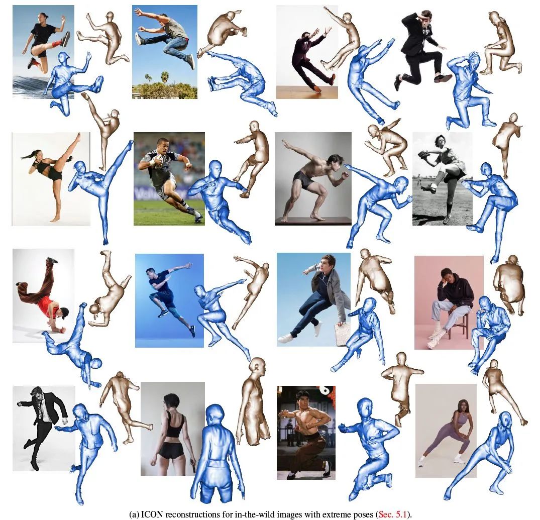 为了充分测试 ICON 在非常难的姿势上是什么水平,我从 pinterest 上找了一些动作非常离谱的图片,武术、跑酷、舞蹈以及体育等等。总之,这些动作从未出现在训练集中,也不可能成为训练集(动作转瞬即逝,没法稳定住用仪器进行扫描捕捉)。但结果是令人欣慰的,尽管不完美,但至少还是个人形。