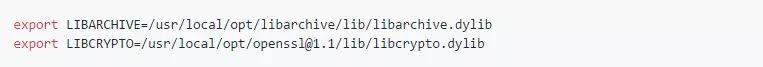 库。OpenDrop依赖于OpenSSL和libarchive的当前版本。macOS附带了这两个的相当旧的版本,所以你需要安装更新的版本,例如,通过Homebrew。在任何情况下,你都需要相应地设置两个环境变量LIBARCHIVE和LIBCRYPTO。例如,使用brew安装这两个库: