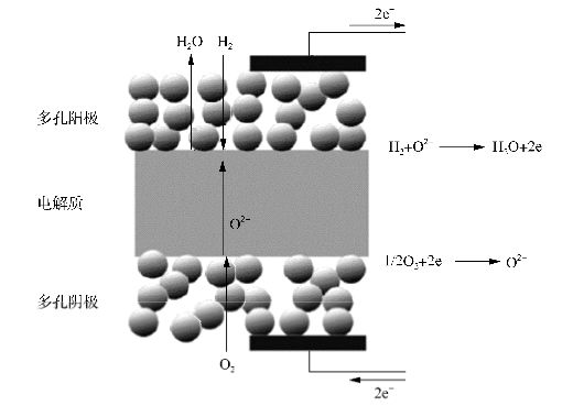 SOFC 主要由固体氧化物电解质、阳极(燃料气电极)、阴极(空气电极)和材料组成。SOFC 的工作原理如图1所示。