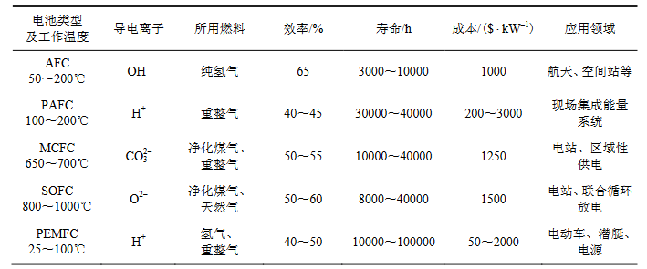 按所用电解质的不同,燃料电池可分为碱性燃料电池(alkaline fuel cell,AFC)、磷酸型燃料电池(phosphoric  acid  fuel  cell,PAFC)、熔融碳酸盐燃料电池(molten carbonate fuel cell,MCFC)、质子交换膜燃料电池(proton exchange membrane fuel cell,PEMFC)和固体氧化物燃料电池(SOFC)等。目前,燃料电池的研究重点为SOFC和PEMFC,并向商业化发展。表1是目前各种燃料电池技术的发展状态。