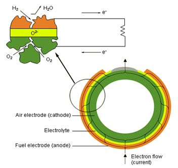 高的工作温度(一般在600°C以上)有效地提升了电极的反应活性,使其不必像其他低温燃料电池那样使用贵金属催化剂,而代之以廉价的氧化物电极材料。