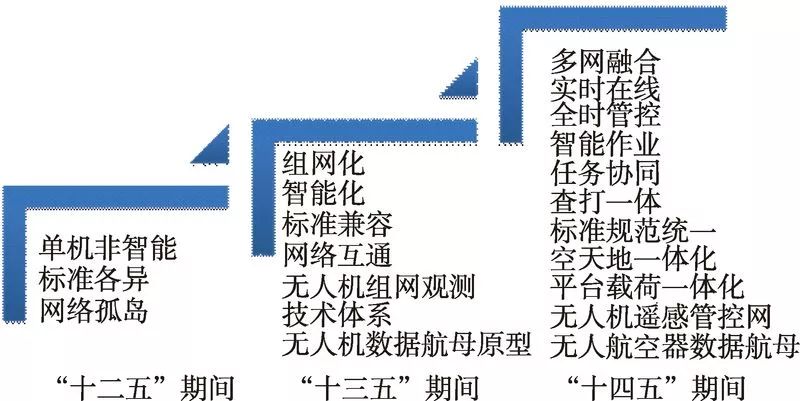 2016年至今的国家第十三个“五年计划”期间,国家科技部扩大了无人机遥感标志性领域和技术的支持。其中,代表性的有中国科院学地理科学与自然资源研究所牵头的重大研发计划项目“高频迅捷无人航空器区域组网遥感观测技术”(2017YFB 0503000),面向需求,突破多元平台组网关键技术,研发集成组网观测硬件设备系统和规划调度与安全管控系统,实现资源优化、规划调度、产品和服务等协同一体的区域组网,构建融合国家野外科学观测台站为无人航空器空港的组网观测体系,具备常态化服务的能力。