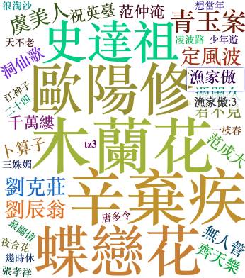 看来在宋词三百首中,出现最多的词语是『作者』,『词文』,『词牌』,总共出现了310次。这是因为每首诗词开始时,文档中都会介绍这首诗词的作者、词文和词牌,从而干扰了我们的文本分析。
