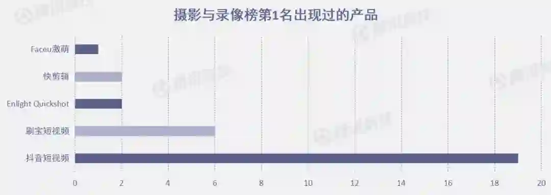 共 5 款产品陆续霸榜摄影与录像榜单第 1 名,其中抖音短视频霸榜 19 天。