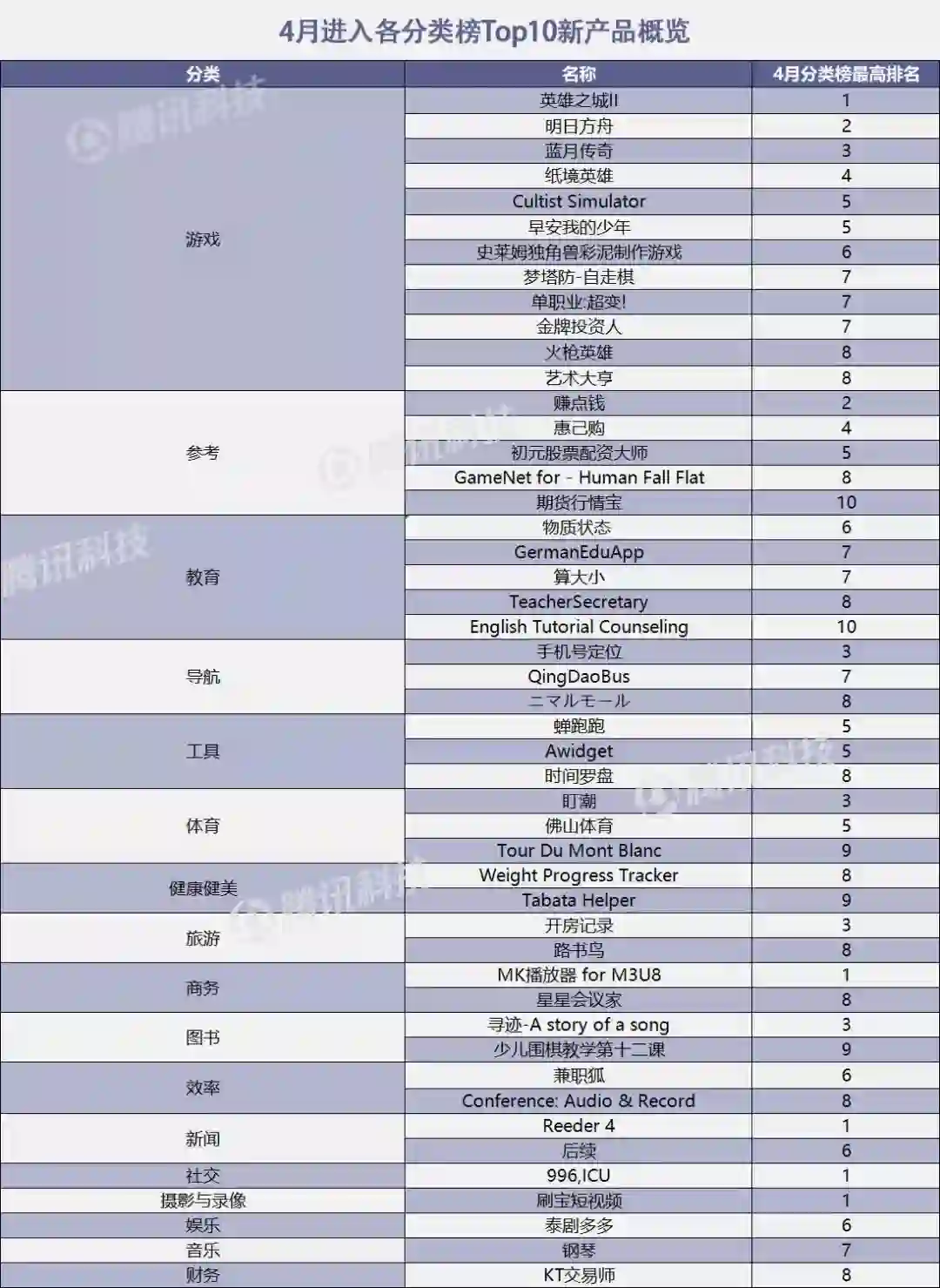 4 月份,共 19 款产品出现在娱乐榜 Top10: