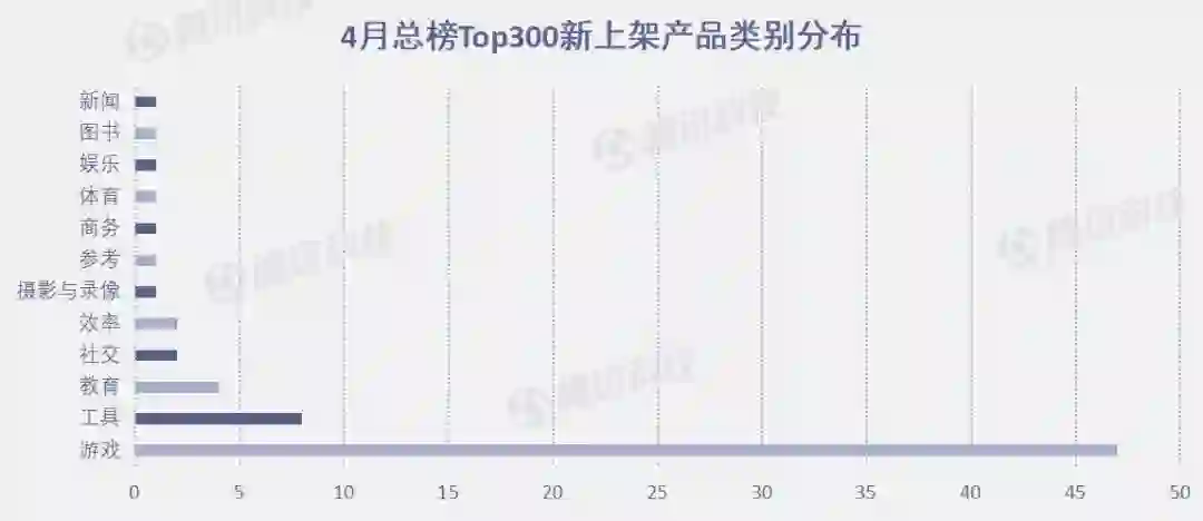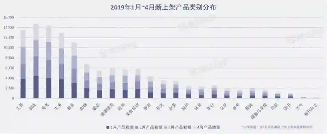 4月份,新上架产品集中分布在工具、游戏、商务、生活、教育类。