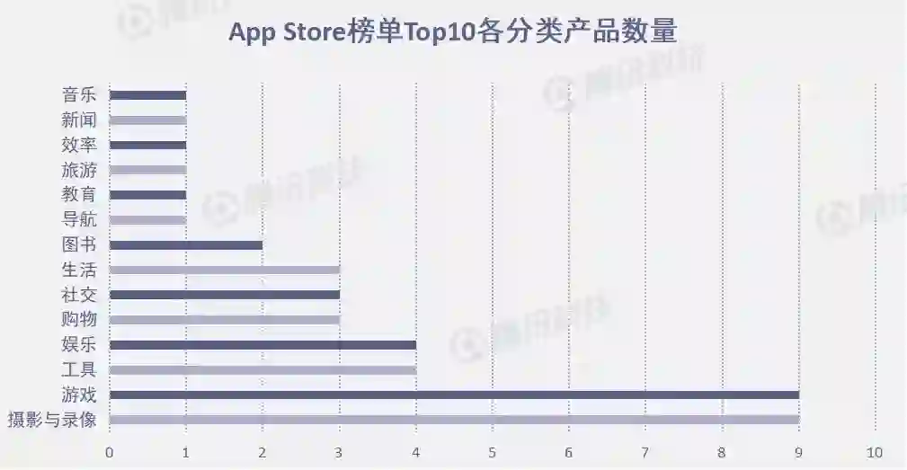 其中,摄影与录像、游戏类居多,分别占据 9 款。