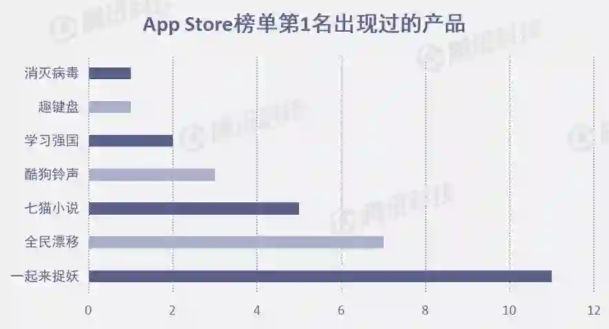 4 月份共 7 款产品登顶过总榜第 1 名,4 月中旬开始,腾讯旗下 AR 手游“一起来捉妖” 11 天位居总榜第 1 名。