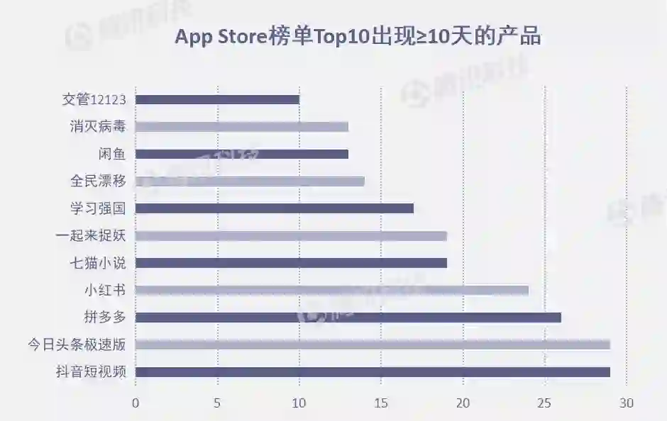 过半产品在总榜 Top 10 出现不足 10 天,11 款产品出现超过 10 天。