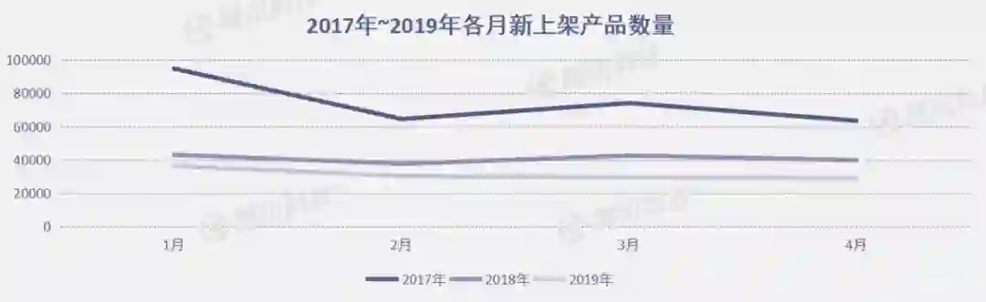 1、4 月份新上架产品近 2.9 万款,同比 2017 年、2018 年 4 月份持续下滑。
