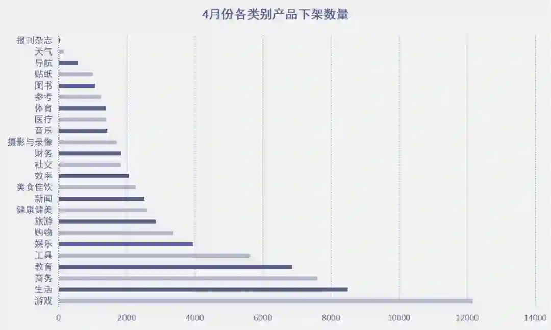 4 月份,近 7.4 万款产品下架,游戏类产品下架数量最多,达 1.2 万款。