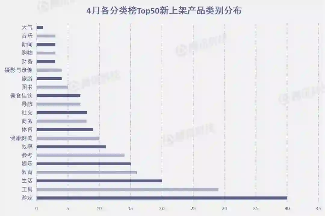 游戏类产品最多,有 40 款进入游戏榜 Top50;