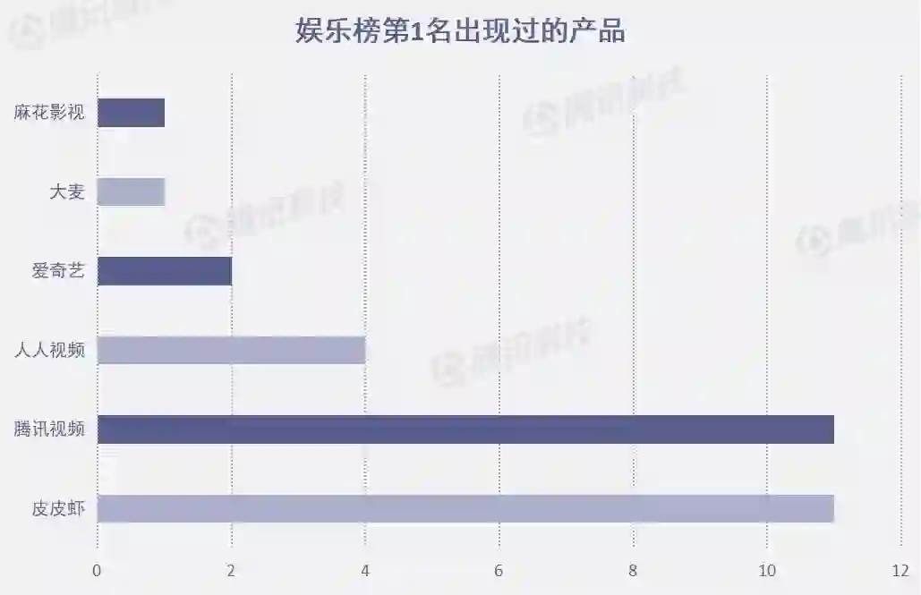 出现在娱乐榜第 1 名的产品分别是:皮皮虾、腾讯视频、人人视频、爱奇艺、大麦和麻花影视。
