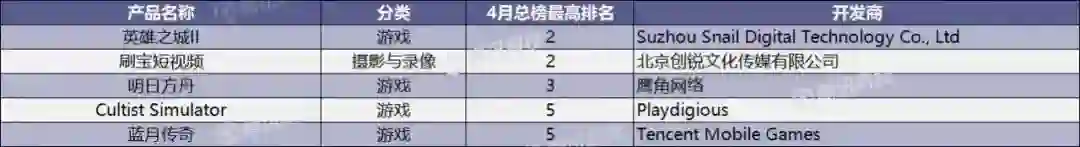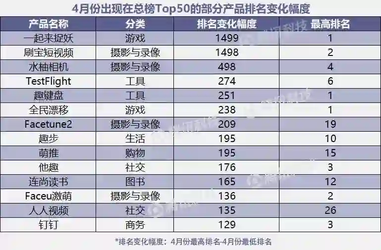 4 月正式开放使用的“一起来捉妖”及新上架产品“刷宝短视频”排名变化最抢眼,最高排名分别为总榜第 1 名和 第 2 名。