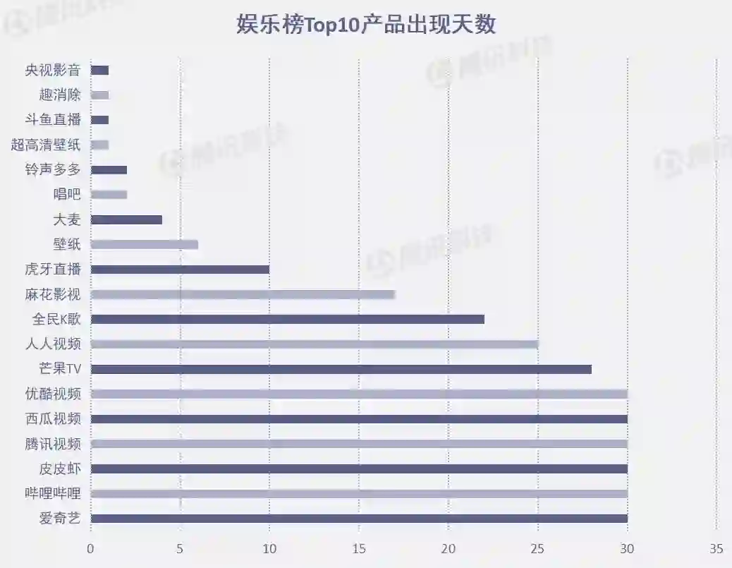百度、腾讯、今日头条和 B 站旗下产品位居娱乐类产品头部地位,爱奇艺、优酷视频 、腾讯视频、皮皮虾、西瓜视频和哗哩哗哩 6 款产品连续 30 天均在 Top10 之列。