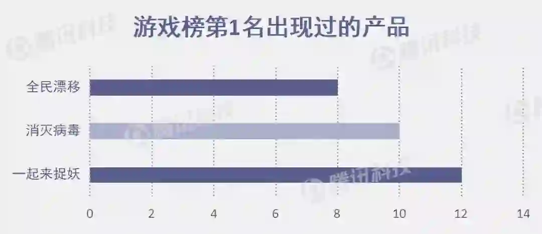 一起来捉妖、消灭病毒和全民漂移轮流位居 4 月游戏榜单第 1 名。