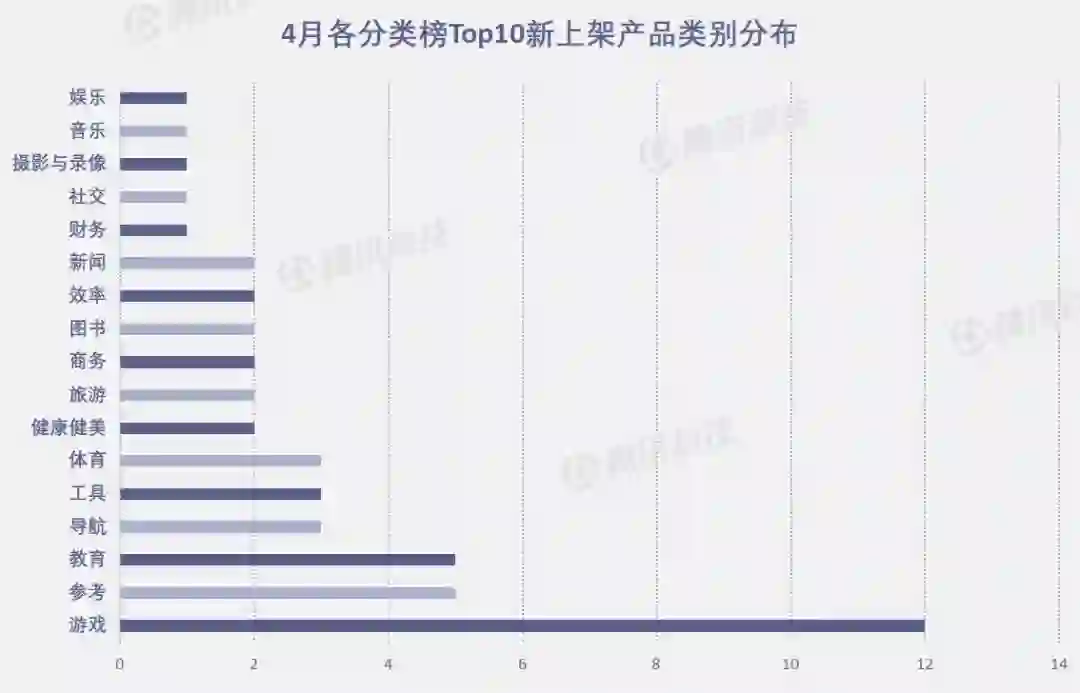 游戏类新产品表现抢眼,12 款进入游戏榜 Top10,参考类和教育类分别以 5 款居次。