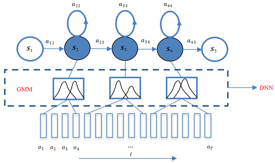 则"今天"的词HMM由"j"、"in1"、"t"和"ian1"四个音素HMM串接而成,形成一个完整的模型以进行解码识别。这个解码过程可以找出每个音素的边界信息,即每个音素 ( 包括状态 ) 对应哪些观察值 ( 特征向量 ),均可以匹配出来。音素状态与观察值之间的匹配关系用概率值衡量,可以用高斯分布或DNN来描述。