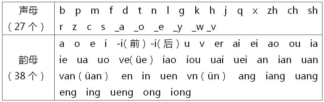 但普通话的韵母很多是复韵母,不是简单的元音,因此拼音一般分为声母 ( initial ) 和韵母 ( final )。汉语中原来有21个声母和36个韵母,经过扩充 ( 增加a o e y w v ) 和调整后,包含27个声母和38个韵母 ( 不带声调 ) ,如表1-1所示。