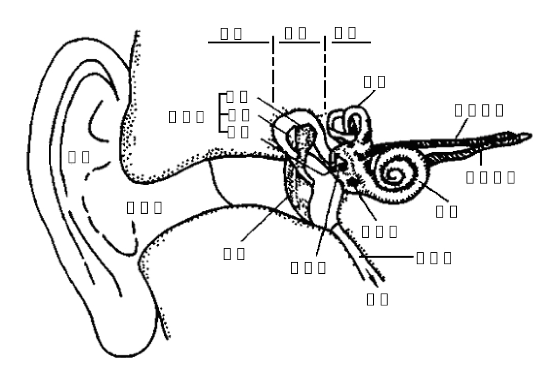 外耳包含耳翼和外耳道,耳翼的作用是保护耳孔,并具有定向作用。外耳道同其他管道一样也有共振频率,大约是3400 Hz。鼓膜位于外耳道内端,声音的振动通过鼓膜传到内耳。中耳由三块听小骨组成,作用包括放大声压和保护内耳。中耳通过咽鼓管与鼻腔相通,其作用是调节中耳压力。内耳的耳蜗实现声振动到神经冲动的转换,并传递到大脑。