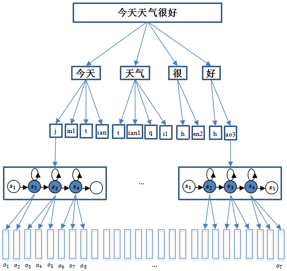 例如,对"今天天气很好"进行词序列、音素序列、状态序列的分解,并和观察值序列对应,如图1-5所示。其中每个音素对应一个HMM,并且其发射状态 ( 深色 ) 对应多帧观察值。