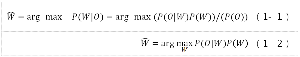 语音识别过程是个复杂的过程,但其最终任务归结为,找到对应观察值序列O的最可能的词序列W。按贝叶斯准则转化为: