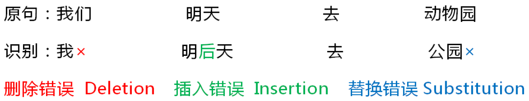 其中,NRef表示测试集所有的词数量,NDel表示识别结果相对于实际标注发生删除错误的词数量,NSub代表发生替换错误的词数量,而NIns则表示发生插入错误的词数量。