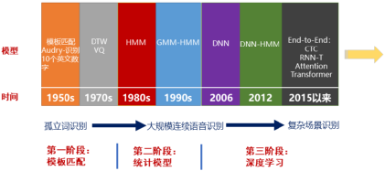 图1-7给出了语音识别技术的发展历史,主要包括模板匹配、统计模型和深度学习三个阶段。