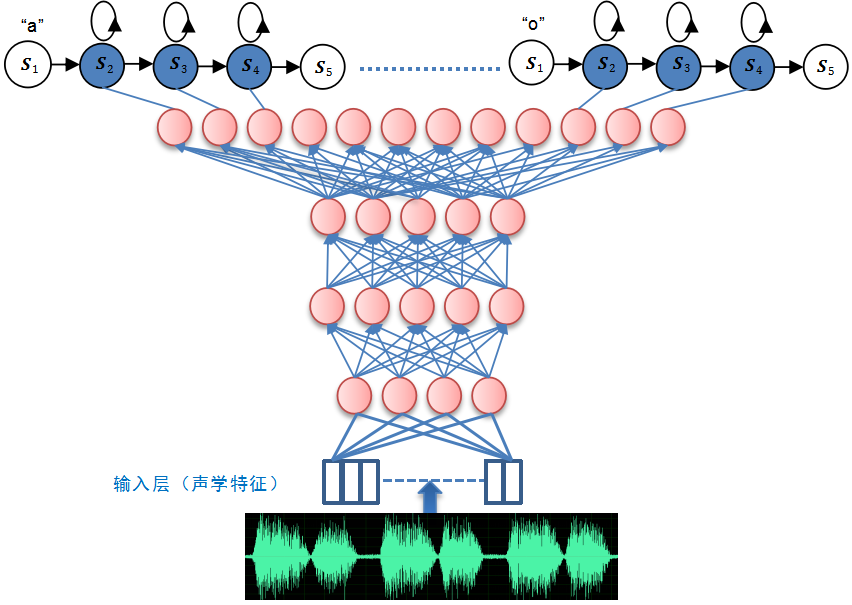 DNN的输出节点与所有HMM ( 包括"a"、"o"等音素 ) 的发射状态一一对应 ( 如图1-11所示 ),因此可通过DNN的输出得到每个状态的观察值概率。