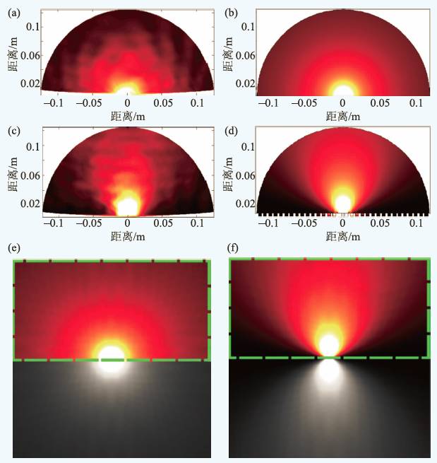图1 数值模拟和实验观察的单极子和偶极子图案辐射。当声波透过没有刻上亥姆霍兹共鸣器的铁块样品后的实验(a)以及模拟(b)的声强分布图;当声波透过带有亥姆霍兹共鸣器的样品后的实验(c)以及模拟(d)的声强分布图;(e,f)模拟的单极子以及偶极子的声强分布图(为了便于比较,图中上半平面用绿色的虚线框加以标记)