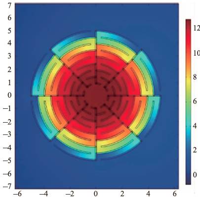 我们使用有限元模拟软件的声固结构耦合模块进行模拟。在模拟中,我们使用的Mie 结构材料为环氧树脂,固体墙厚度为2 mm,Z字型通道宽度为6 mm,弯折次数N=4,结构外半径为40 mm,内半径为14 mm,等效减慢声速约2.6 倍。具有该几何参数的结构的单极子共振频率约为1300 Hz。在模拟中,我们在左侧给出一个向右传播的平面波来作为入射波,发现在1360 Hz 附近得到了最为理想的单极子Mie 共振现象,这和理论计算结果符合的非常好。图6 展示了单极子共振模式的特点:声压聚集在Mie 结构中心,且中心处声压大小是入射波声压的数倍,但这个汇聚的能量沿径向迅速衰减,而它们的法向分布大致均匀。在找到了共振频率并验证了理论推导的正确性之后,我们继续关注这个Mie 结构的散射声场,如图7 所示,该Mie 结构的散射声场非常显著,在入射波声压绝对值只为1 的情况下,它的散射场声压幅值在0.7 左右。我们必须注意到,该Mie结构的半径尺寸只有40 mm,而1360 Hz 下空气中声波波长为250 mm,也就是说,该Mie结构可以在自身尺寸远远小于波长的情况下显著地散射声波,这是任何通常材料都无法做到的事情,Mie共振正是我们不断寻找的、能够帮助我们调控低频声波的新型材料。