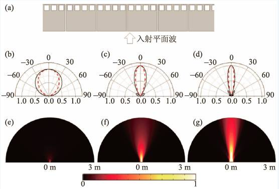 假设n 等于1,3 或5,相邻狭缝之间的距离为 6 cm,亥姆霍兹共鸣器(HR)的颈部宽度为0.08 cm。其他参数与图1 相同。在此,有效边界阻抗满足|Zs /ρc0| ≈ 1.0 。为了避免线阵列次极大值的出现,两个相邻狭缝之间的总长度应该小于λ/2 。如图3(a)所示,入射平面波从没有HR的表面入射。在这里,狭缝的数量对应于偶极子源的数量。在有限元仿真模拟中,图3(b)—(d)分别显示了1 个偶极子源(1 个狭缝),3 个偶极子源(3 个狭缝)和5 个偶极子源(5 个狭缝)的远场方向性。如图3(b)—(d)所示,其中实线表示理论结果,虚线表示数值模拟结果。显然,5 个偶极子源的远场方向性可以比1 个偶极子源或3 个偶极子源的远场方向性更好。具有不同狭缝的声强度的偶极子辐射图如图3(e),(f),(g)所示,对应于图3(b),(c),(d)中的理论预测。偶极子阵列具有比一个偶极子源更高的辐射效率。这些结果表明,可以用周期性的HR 和几个狭缝来实现偶极子的阵列。