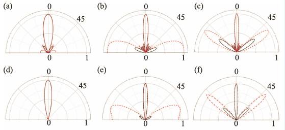 图4(a),(b),(c)显示了偶极阵列(实线)和单极子线阵(虚线)的方向性函数的理论结果;图4(d),(e),(f)偶极阵列(周期性HR)和单极子线阵阵列(无周期性HR)的指向性的有限元仿真结果。这些结果表明,出现在单极子阵列中的次极大值可以为零,并且其他角度的次极大值可以在偶极子阵列中被削弱。换句话说,出现在单极子阵列中的次极大值可以被削弱或者甚至消除。因此,偶极阵列在更宽的频率范围内具有更好的方向性,并且具有比单极子阵列更小的旁瓣。