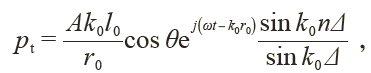 我们进一步研究了偶极子阵列的指向性。偶极子线性阵列由n 个偶极子源构成,相邻偶极子源之间的距离为l。所有偶极子源具有相同的相位和体积速度。每个偶极子源的声压可以表示为p =Ak0l0/r cosθej(ωt - k0r), 其中压力的大小是| A| ,k0 = ω/c0 , ω 是角频率,r 是从源到观察点的距离, 并且l0 是具有相反相位的两个点源之间的距离。因此, 总压力可以表示为pt =Σi=1n Ak0l0/ri cosθej(ωt - kri)。如果r ≫ (n - 1)l ,来自不同声源的声波到达观察点可以认为是具有相同的幅度,从线阵列的参考点到观察点的距离为r0 ,那么第n个阵元到观察点的距离为r0 + (n - 1)l/ sin θ 。θ = 0 方向与y 方向同向, θ 范围是(-π/2,π/2) 。所以