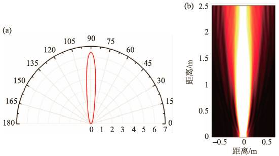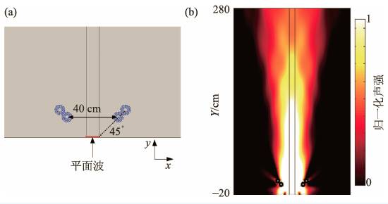 图2 准直声束(a)具有负的阻抗边界情况下的点源辐射的理论计算指向性图;(b)具有负的阻抗边界情况下的点源辐射出的声波的数值模拟声强分布图