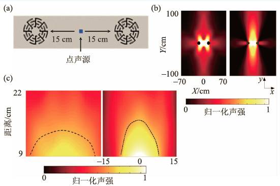 图8 (a)全指向点声源和离声源15 cm 处的两个对称放置的相同的米氏结构;(b)固体结构和亚波长米氏共振结构的声强分布的模拟结果;(c)固体圆柱结构和亚波长米氏共振结构的实验结果