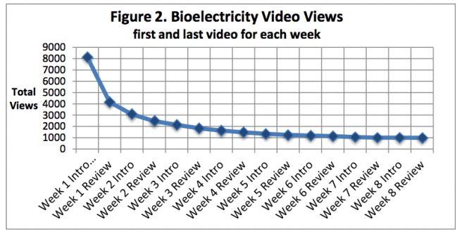 案例研究:12000人在Coursera上开始了第一次“生物电”慕课。其中,八千人打开了至少一个视频,一千人看了所有的录像,只有350人完成了这门课程。