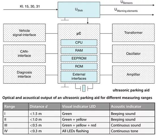 被动式主要利用超声波传感器+蜂鸣器+HMI图标来提示驾驶者外部障碍物情况,防止车辆在倒车时碰撞,一般由下面几个功能构成: