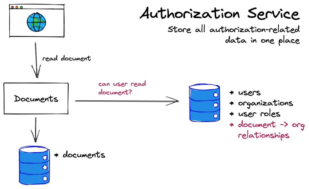 当你将应用程序拆分为不同的服务时,会发生什么情况?也许你已经剥离了一个新的“文档服务”——现在,检查特定文档的读权限需要检查位于该服务数据库之外的用户角色。文档服务如何访问它所需要的角色数据?