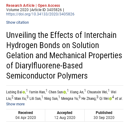 近期,面向柔性光电子器件的可控制备,西北工业大学黄维院士团队和南京工业大学林进义教授提出超分子功能化策略,在光电高分子侧基引入动态可逆的超分子弱作用,在保证材料高稳定性光电性质的同时,实现材料薄膜本征可拉伸特性,创造性提出薄膜原位剥离方法实现薄膜本征机械特性的精准表征,为定性定量化光电高分子柔性行为提供了一种普适性测试手段,为设计柔性高分子材料及其本征机械特性评估提供指导。在该工作中,黄维院士团队成员在活性共轭聚合物侧链引入不同比例的酰胺基团,系统研究了链间动态可逆超分子氢键作用对溶液凝聚态性质及聚合物薄膜本征柔性可拉伸性能的影响,相关成果以“Unveiling the Effects of Interchain Hydrogen Bonds on Solution Gelation and Mechanical Properties of Diarylfluorene-Based Semiconductor Polymers”为题,发表在Research上(Research, 2020, 3405826, DOI:10.34133/2020/3405826)。