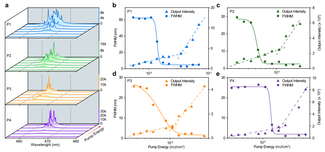此外,作者采用飞秒激光器对薄膜的光增益性能进行了表征,在泵浦能量超过一定值后,P1-P4发射峰的半峰宽迅速窄化,并产生随机激光发射,阈值分别为1.38、0.52、0.70和1.32 µJ/cm2,以上结果说明薄膜具有优异的光增益性能。作者认为随机激光产生的主要原因是薄膜内部存在链间氢键交联形成的随机反馈腔,并进一步通过傅里叶变换(Fourier transform,FT)对微反馈腔的尺寸进行估算,约为30 ~ 60 µm。这些结果表明:氢键功能化的芴基聚合物具有优异的光增益性能,在有机激光器等领域具有潜在的应用。