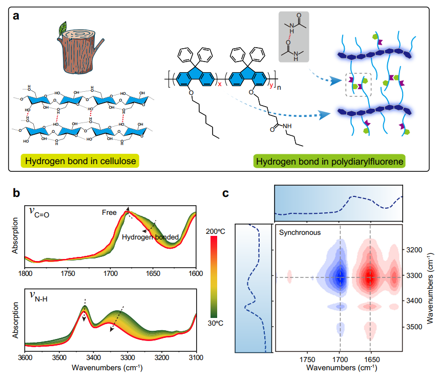 本文中,作者在聚芴侧链引入不同比例的酰胺侧链(10% ~ 40%),从而使共轭主链之间形成氢键交联网络,并通过变温FT-IR对其进行了验证。随着温度升高,3330 cm-1处(N-H)的峰值变化与1680 cm-1处(游离C=O)的峰值变化之间是正相关的,与1650 cm-1处(键合C=O)的峰值变化是负相关的,即温度升高使氢键断裂,键合的羰基减少,游离的羰基增多,充分说明聚芴分子链间氢键的形成。