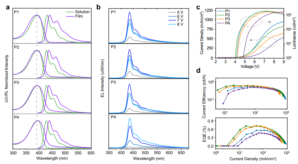 对溶液和薄膜的吸收和发射光谱测试表明,链间氢键对材料稀溶状态下的吸收和发射并没有明显的影响。而随着氢键比例的提高,薄膜的吸收发生了轻微的红移。对于薄膜PL光谱,位于439 nm处的0-0发射峰均高于465 nm处的0-1发射峰,未出现聚集引起的低能绿光带发射。PLEDs器件测试发现,P1、P2和P3的启动电压约为4.2 V,而P4的启动电压在4.7 V。其中,P1-P4器件的最大亮度分别为1809、1913、1689和1658 cd/m2,器件的最大电流效率基本一致。P2和P3器件的EQE均在0.7%左右,略高于P1的0.6%和P4的0.5%。以上数据表明,链间氢键主要通过影响发光层的形貌进而影响PLEDs的器件性能,因此欲获得较高性能的PLEDs,需要进一步优化链间氢键对薄膜形貌的影响。