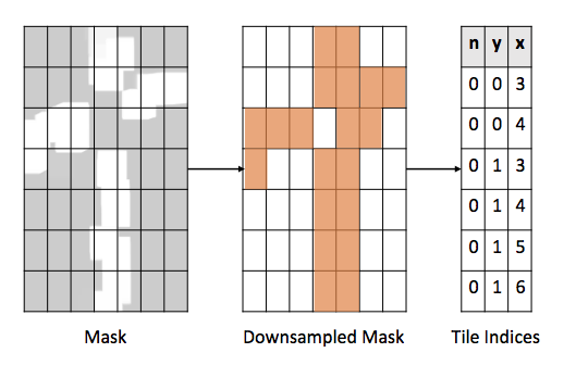 图 2:为了利用 CNN 激活中的稀疏性,SBNet 首先将计算掩码转换成 tile 索引列表