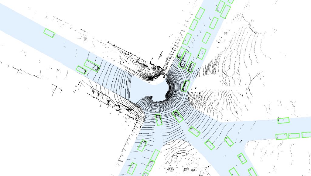 图 4:我们的 LiDAR 3D 车辆检测使用了道路地图作为计算掩码(蓝色),ground-truth 用方框表示(绿色)