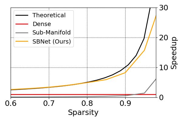在使用 SBNet 时,我们测量了两种变体相对于基准检测器的显著提速。在下面的图 5 中,我们给出了输入数据在不同稀疏程度下测得的速度提升。