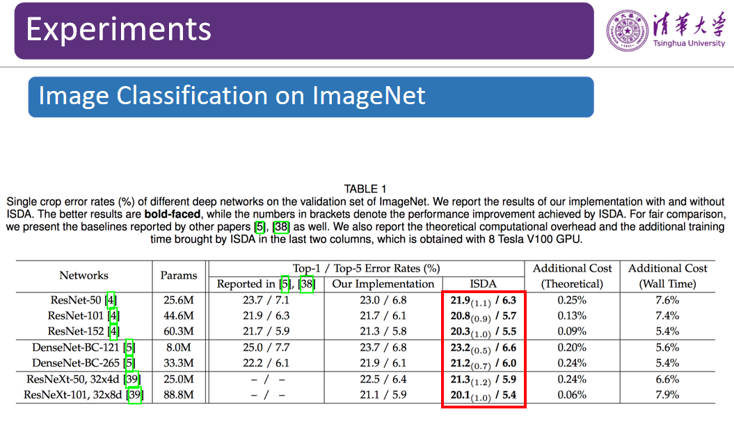 为了验证 ISDA 的数据扩增效果,黄高博士团队在多个数据集上进行了对比实验。在分类任务中,ISDA 可以将 ResNet-50 模型在 ImageNet 数据集上的误差率从 23.0% 降低至 21.9%,这个提升在 ImageNet是较为显著的。